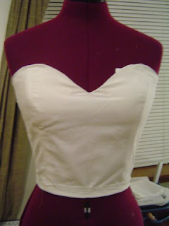 I did not include a waist stay since the foundation isn't the only thing holding up the dress. The halter straps will do most of that work, thankfully. Here's a shot of the inside of the foundation, folded so you can see the boning on the innermost layer and the bra cups sewn to the other.