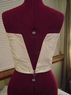 I also constructed the foundation with some light boning and some sew-in bra cups. I don't know if this get-up will actually make it into the finished dress. The muslin I made was pretty complete and it didn't seem to need this level of additional support. My only concern is keeping the deep V back panels in place and some boning could do that if needed. So we'll see. But for now, some details: