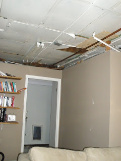 Our first move was to take out the drop ceiling. When we did, we found there was an entirely second ceiling on top of it! We took out all the old electrical but decided to leave the old ceiling panel system since it was attached to the floor joists and thus not taking up coveted height.