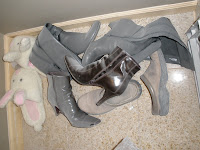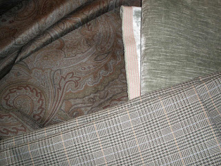 Lastly, as promised, here's a shot of the loot I picked up Sunday afternoon. The paisley is a low pile velour-type deal, the green/gray striated velvet has an awesome sheen that you can see if you look at the strip next to the selvage, and the plaid/houndstooth fabric is a drapery-weight woven. I realize they probably look really dark, but we all know there are two black labs who will call this room home and their fur is not to be messed with.