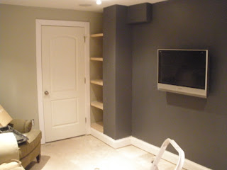 In the picture above you can see the left edge of the gas meter/media closet. To the right of it is a full set of bookshelves, which will house Matt's subwoofer and great works of literature (textbooks, glossy picture books, and chick-lit). I'm going to brag again and let you know I built the top half of the shelves, too, using some construction fundamentals found over at Knockoffwood.