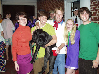 Over the years we've been sure to include (torment?) Hudgins in all the fun. This was pretty easy in college. I put the short 'do to use one year when I dressed up as Velma from Scooby Doo, Matt was Shaggy, and Hudge was Scooby, natch. We happened to run into a Daphne and Fred so the clan was all represented.Following his master's lead, Hudgins ended up on the fraternity's beer pong table later in the evening.
