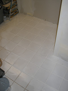 I'll take some cheesecloth to the new tiles tonight to clean up the lingering grout haze. Unlike in the bathroom, I used pre-mixed grout and mortar with this floor. That stuff is about 10x more expensive than the mix it yourself kind but seriously, the convenience factor and general tidiness of it all won me over in no time.